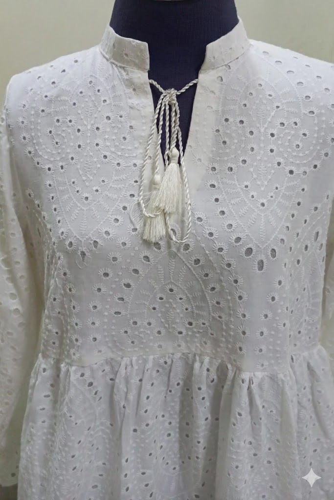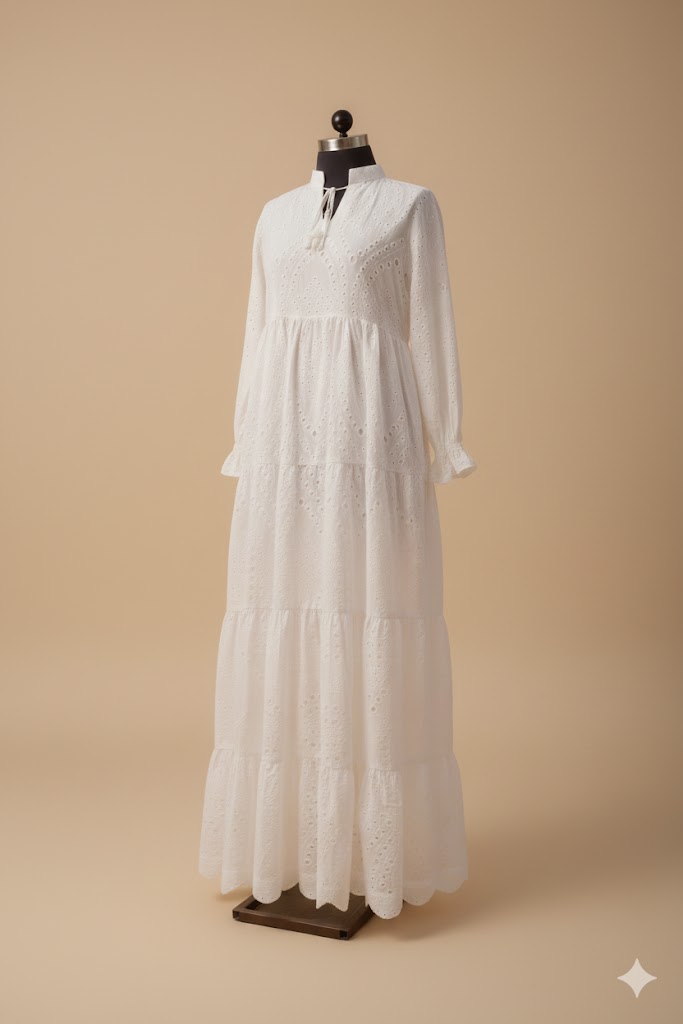 Step into effortless sophistication with our White Eyelet Embroidered Tiered Maxi Dress. This piece is a celebration of texture and light, featuring high-quality eyelet embroidery—often referred to as Chikan Kari—that offers a romantic, vintage-inspired look. Designed with the modern woman in mind, it provides a perfect balance of full-coverage modesty and airy summer comfort.